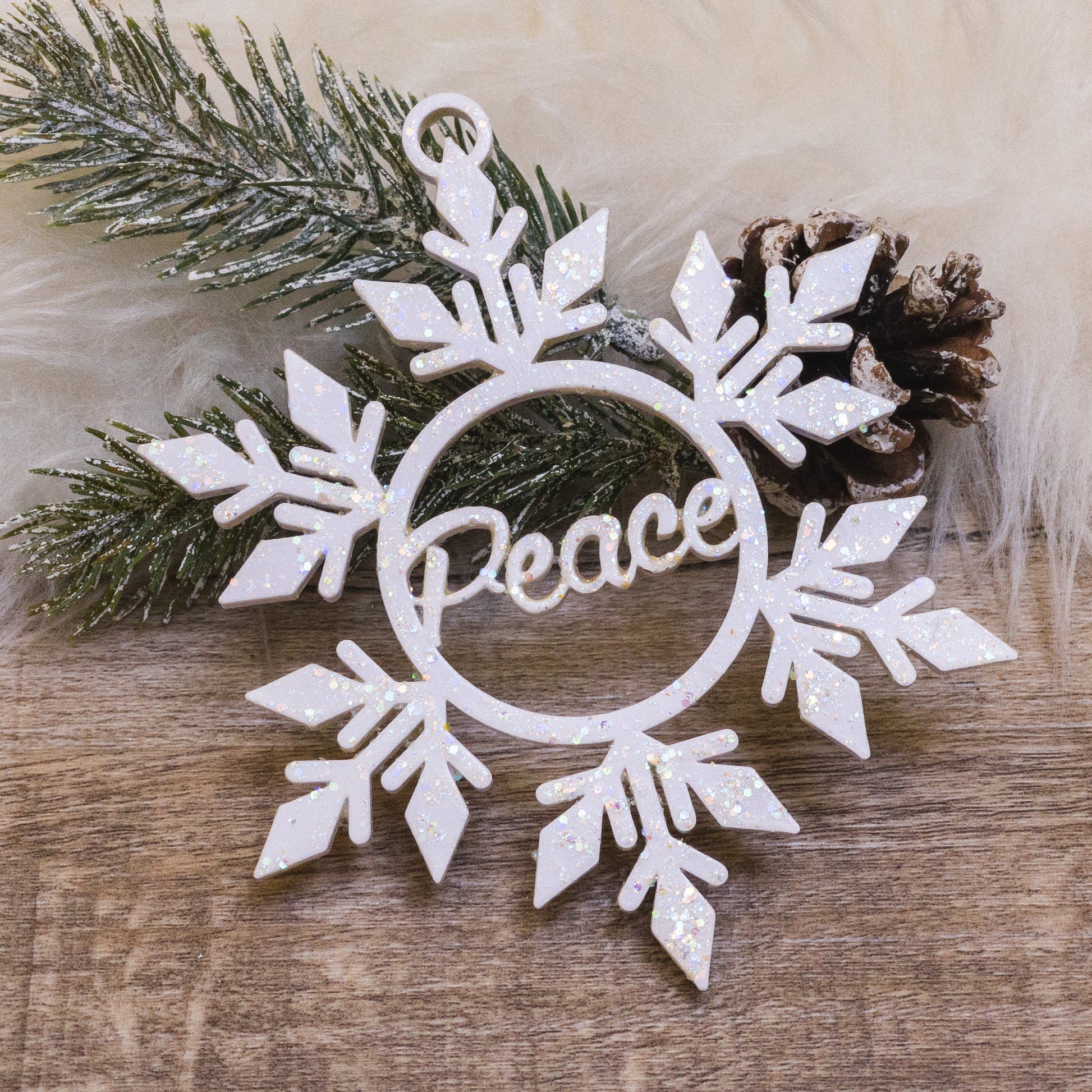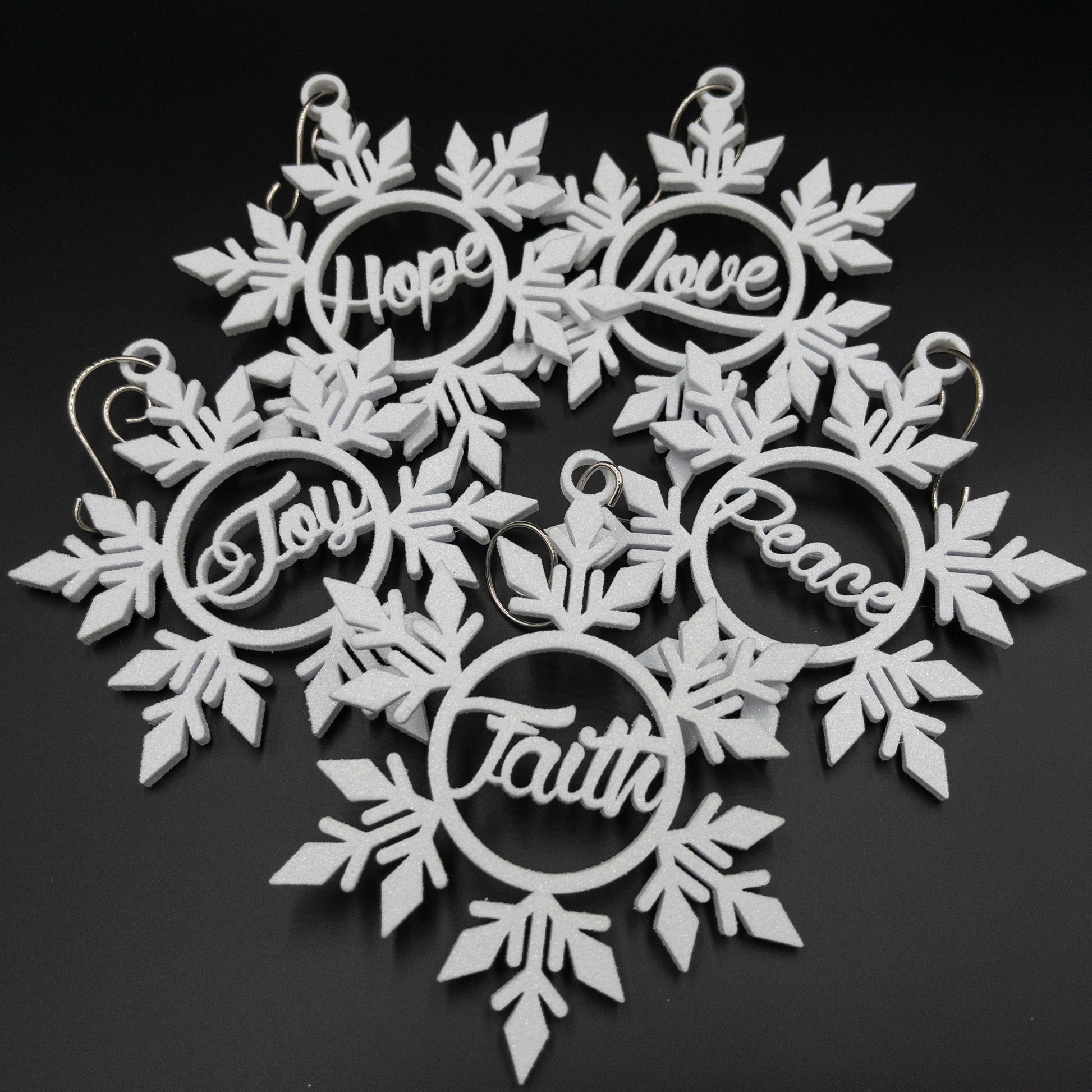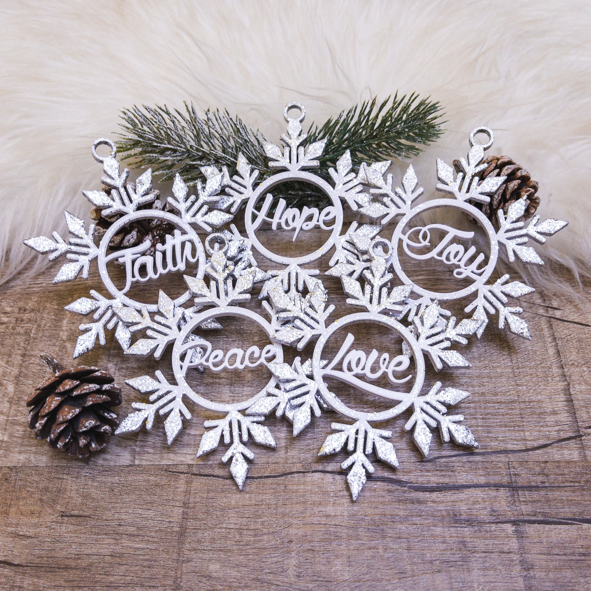 Choose from ready-made designs like Love, Peace, Faith, Joy, or Hope, or create your own custom snowflake with a name or short word of your choice.